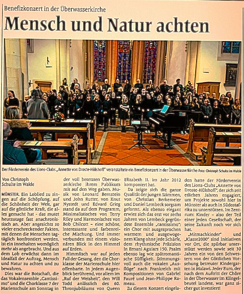Die beeindruckende Akustik der Überwasserkirche bildete einen würdigen Rahmen für das Konzert und unterstrich die musikalische Qualität der Darbietungen. Gleichzeitig stand der Abend ganz im Zeichen des guten Zwecks: Der Erlös des Benefizkonzerts kommt sozialen Projekten des Lions Clubs Annette von Droste Hülshoff zugute.