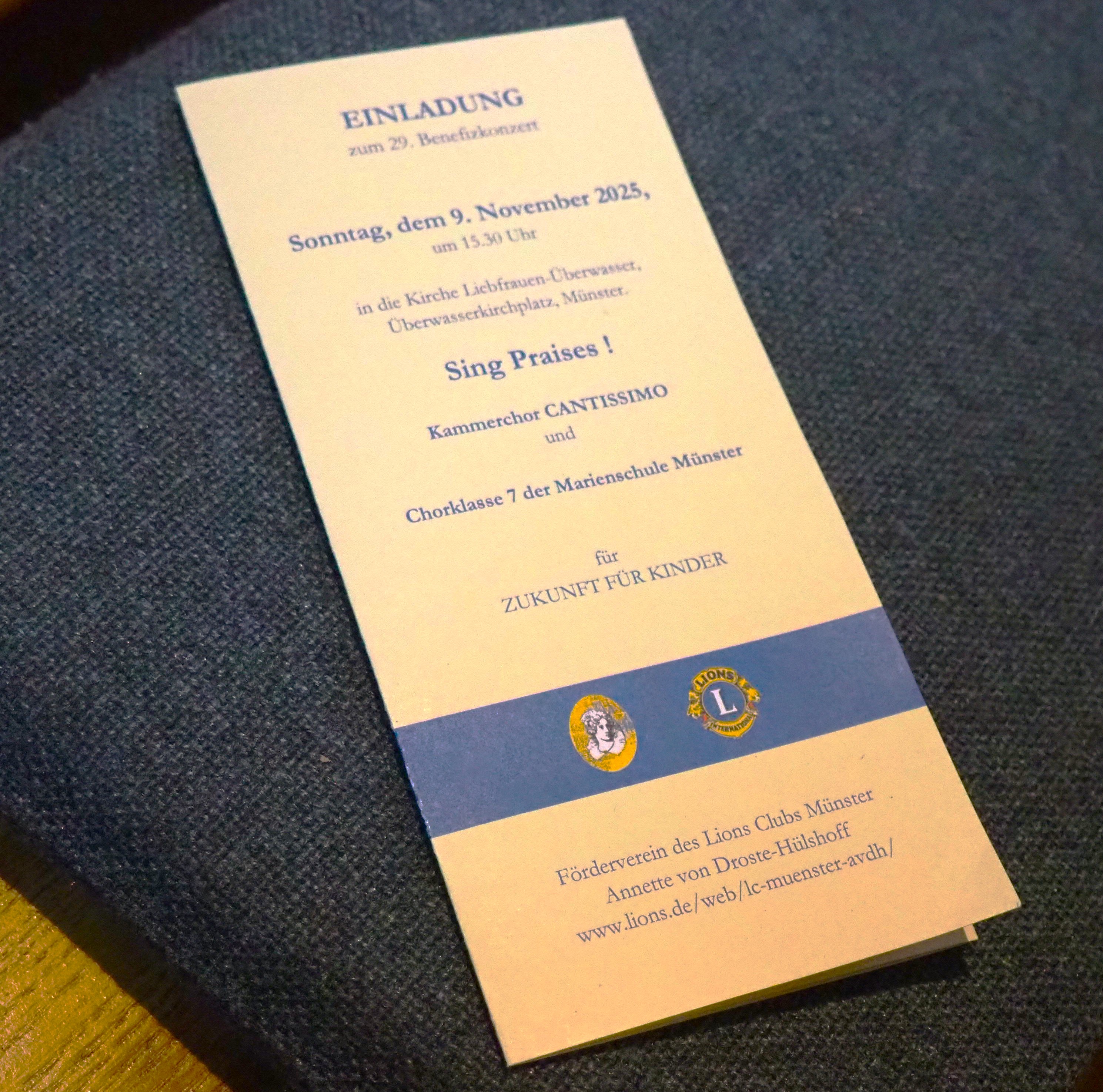 Am 9. November 2025 lud der Lions Club Annette von Droste Hülshoff zu einem besonderen Benefizkonzert in die Überwasserkirche Münster ein. Unter dem Titel „Sing Praises!“ erlebten die zahlreichen Besucherinnen und Besucher einen eindrucksvollen Abend geistlicher und moderner Chormusik.