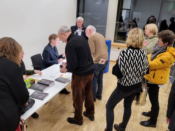 Am Ende der Lesung bildete sich eine lange Schlange vor dem Lesepult der Autorin, wo man das Buch mit Widmung versehen erwerben konnte.