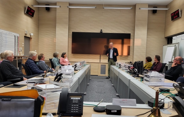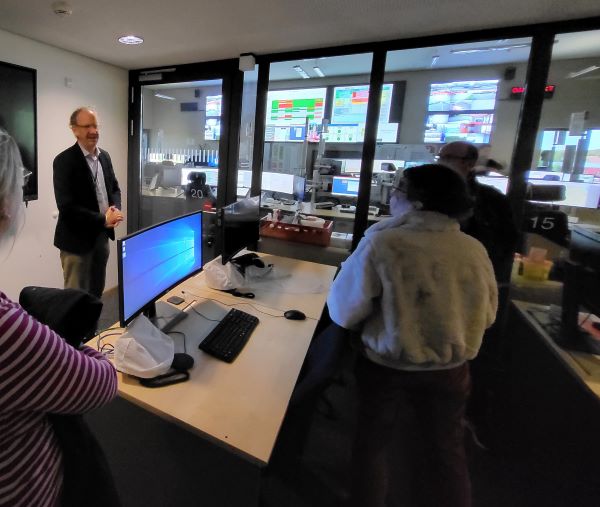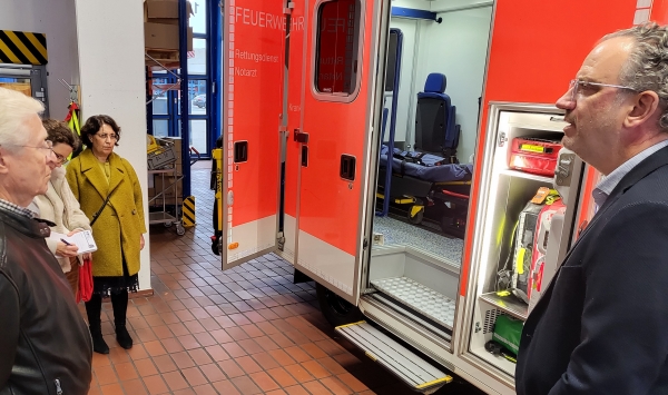 Neben einem Einblick in die Fahrzeuge konnten wir auch das Treiben in der Leitstelle beobachten. Einer der Monitore gab die Kapazitäten der Krankenhäuser und der intensivmedizinischen Kapazitäten an, diese mit den Krankenhäuser abzuklären sei ebenfalls Aufgabe der Leitstelle. Neu sie der Ausbau eines Raumes für Telemedizin, in dem ein Notarzt telemedizinisch zu den Einsatzorten zugeschaltet werden könne (für den gesamten Regierungsbezirk), was v.a. für den ländlichen Bereich mit teils langen Fahrwegen eine deutliche Erleichterung mit sich bringe.
