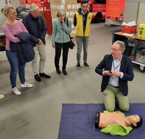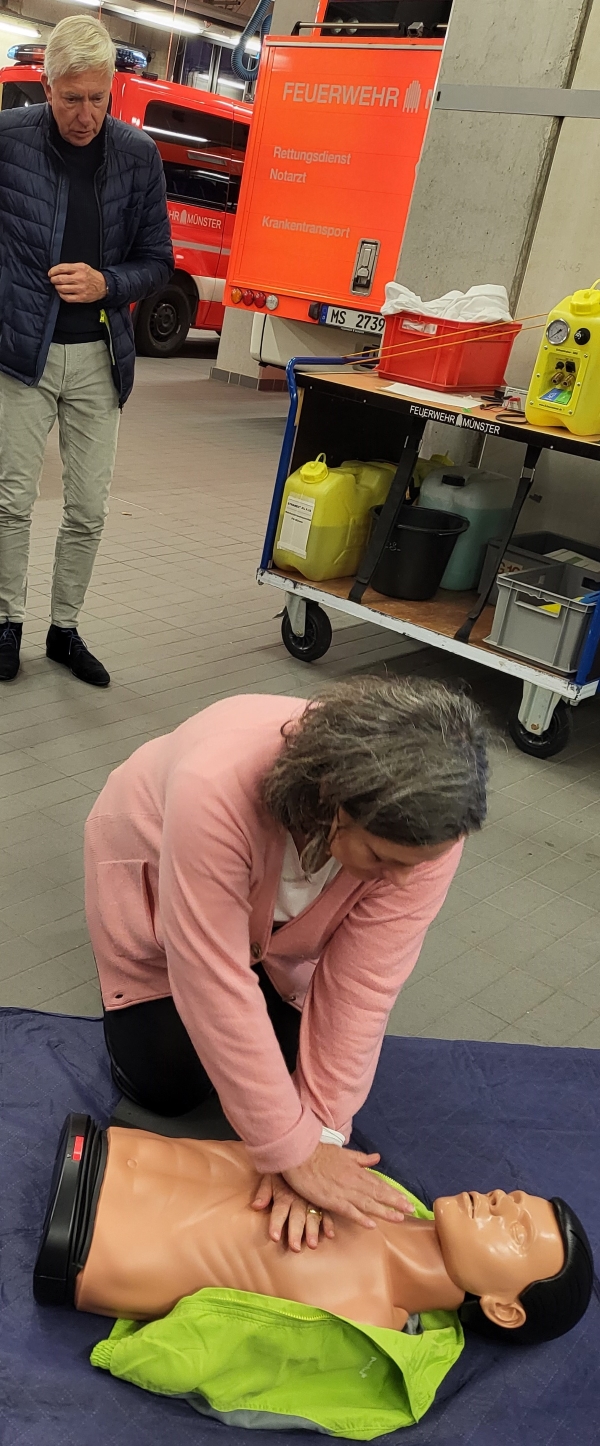 So kamen wir in den Genuß einer professionellen Schulung zur Laien-Reanimation mit praktischer Anwendung an entsprechenden Puppen, wo alle hochmotiviert die überlebenswichtige Herzdruckmassage zu üben.